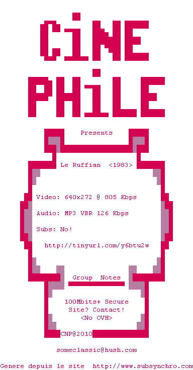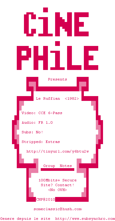 | Voir le nfo de la release Le.Ruffian.1983.FRENCH.DVDRiP.XviD-CiNEPHiLE | CiNEPHiLE | Le.Ruffian.1983.FRENCH.DVDRiP.XviD-CiNEPHiLE OpenSubtitles | 0 fichier | ||