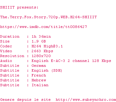 Y avez-vous pense ? Nous proposons déjà 2124 sous-titres pour le film Terry Fox: Le coureur de l'espoir. Avez-vous essaye de voir si ces sous-titres etaient compatibles avec cette release ? On vous laisse le soin de tester cela pour nous et de contribuer au site en postant le sous-titre en cas de compatiblite constatee !