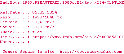 Voir le nfo de la release Bad.Boys.1983.US.ViDEO.VERSiON.1080p.BluRay.x264-OLDTiME