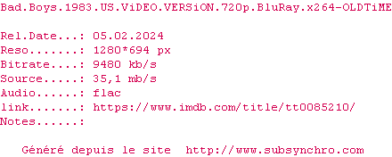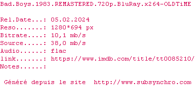 Voir le nfo de la release Bad.Boys.1983.US.ViDEO.VERSiON.720p.BluRay.x264-OLDTiME