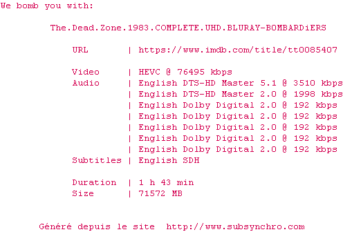 Voir le nfo de la release The.Dead.Zone.1983.COMPLETE.UHD.BLURAY-B0MBARDiERS