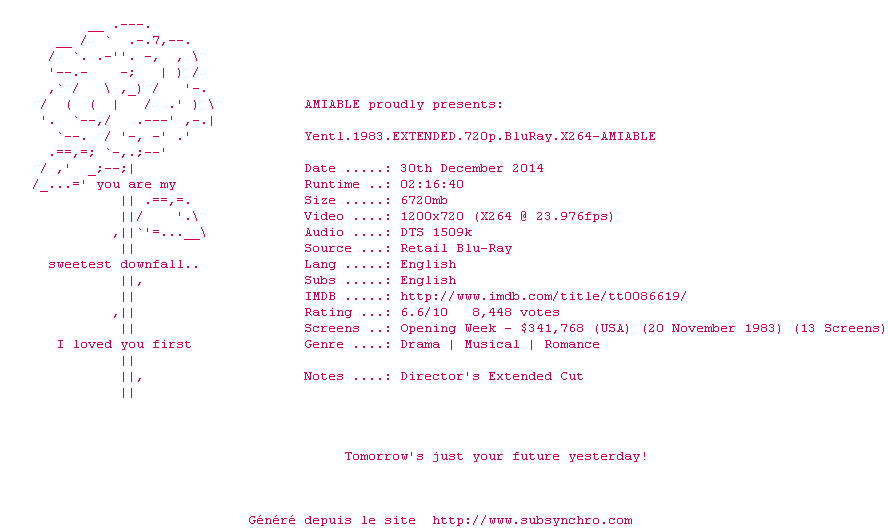 Voir le nfo de la release Yentl.1983.EXTENDED.1080p.BluRay.X264-AMIABLE
