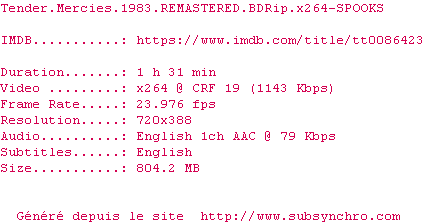 Voir le nfo de la release Tender.Mercies.1983.REMASTERED.720p.BluRay.x264-SPOOKS