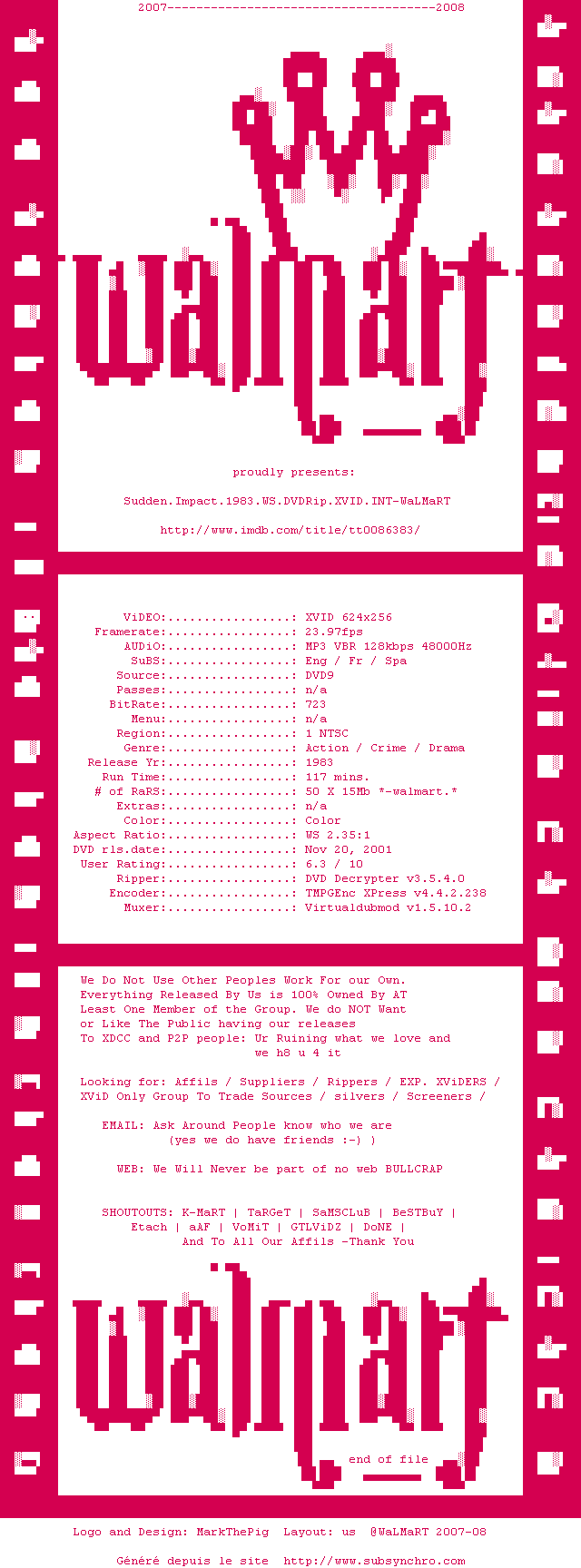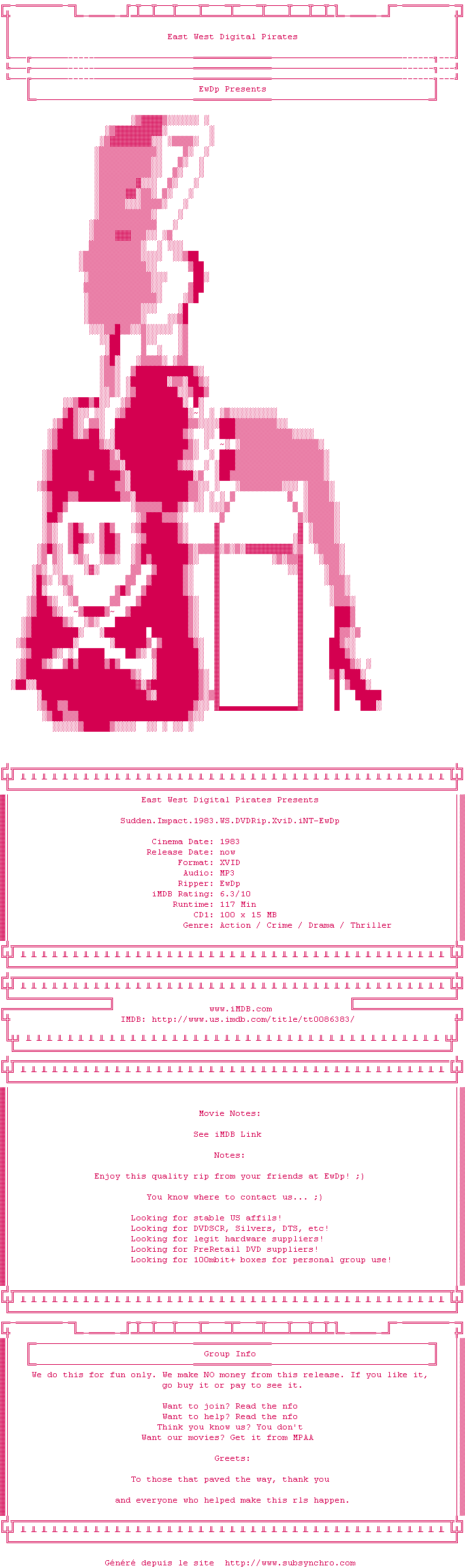 Voir le nfo de la release Sudden.Impact.1983.WS.DVDRip.XVID.INT-WaLMaRT