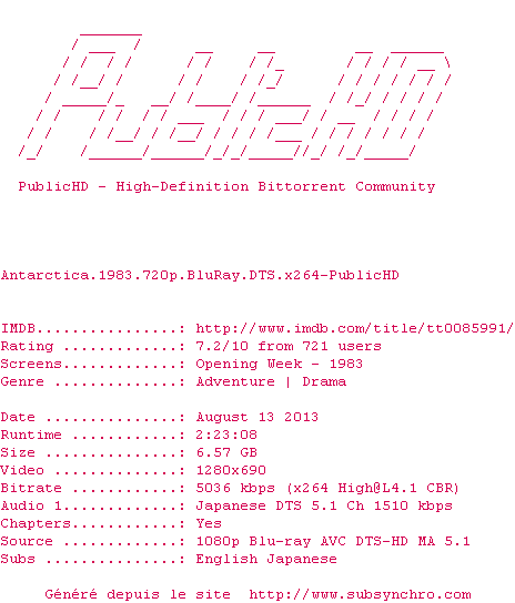 Telechargez le RSS « Fichier de la release Antarctica.1983.720p.BluRay.DTS.x264-PublicHD »