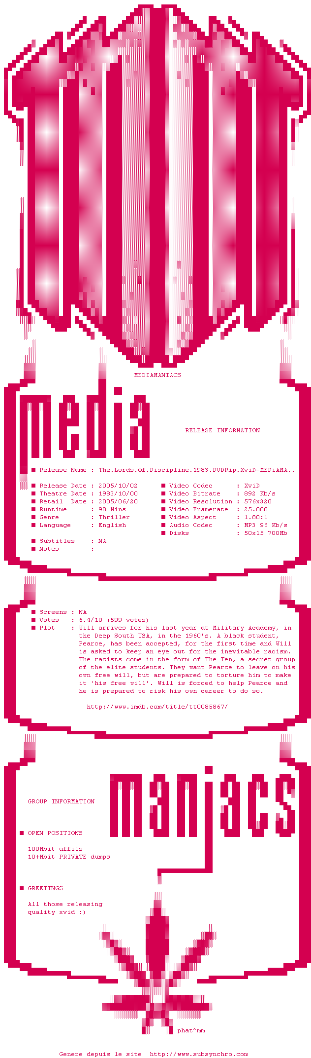 Y avez-vous pense ? Nous proposons déjà 4 sous-titres pour le film La Loi Des Seigneurs. Avez-vous essaye de voir si ces sous-titres etaient compatibles avec cette release ? On vous laisse le soin de tester cela pour nous et de contribuer au site en postant le sous-titre en cas de compatiblite constatee !