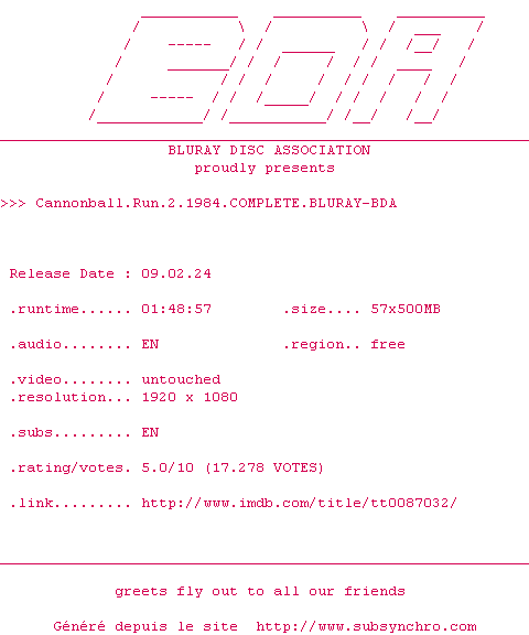 Voir le nfo de la release Cannonball.Run.2.1984.COMPLETE.BLURAY-BDA