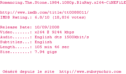 Une comédie d'aventures typique des années 80 avec l'inévitable Danny De Vito et le couple Kathleen Turner et Michael Douglas. Le film est très inspiré des Aventuriers de l'Arche perdu, mais est loin d'avoir la même qualité.
