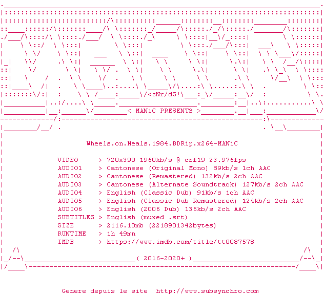 Voir le nfo de la release Wheels.On.Meals.1984.iNTERNAL.BDRip.x264-MANiC
