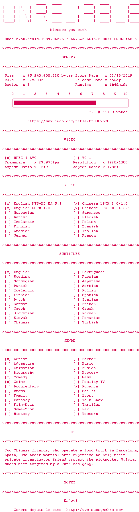 Voir le nfo de la release Wheels.On.Meals.1984.1080p.BluRay.x264-GiMCHi