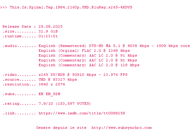 Voir le nfo de la release This.Is.Spinal.Tap.1984.2160p.UHD.BluRay.x265-4KDVS