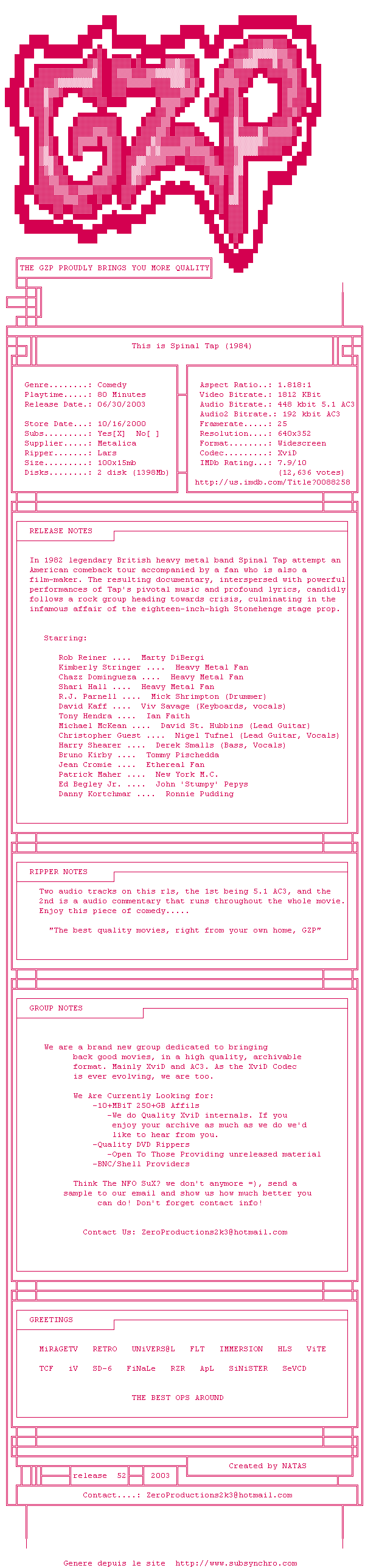 Voir le nfo de la release This.Is.Spinal.Tap.1984.DVDRip.XviD.AC3.iNTERNAL-GZP
