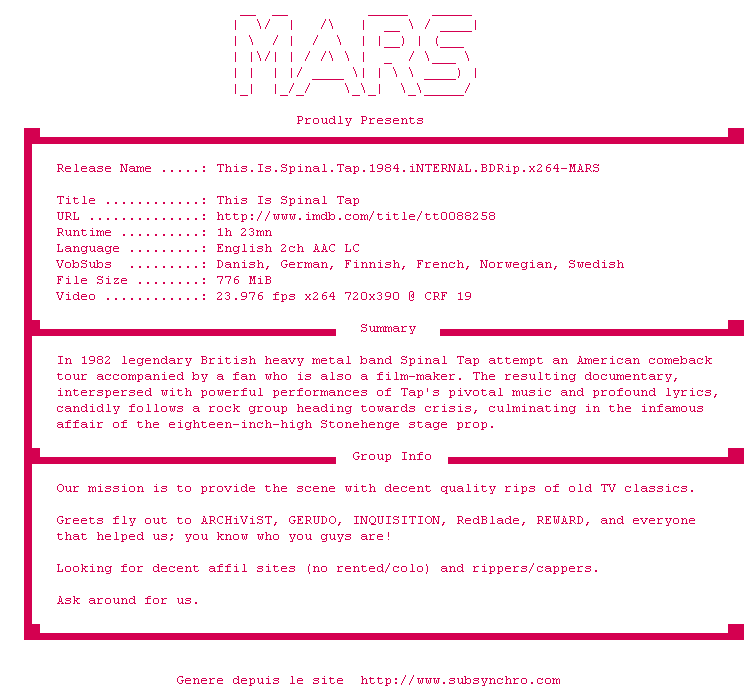 Voir le nfo de la release This.Is.Spinal.Tap.1984.iNTERNAL.BDRip.x264-MARS