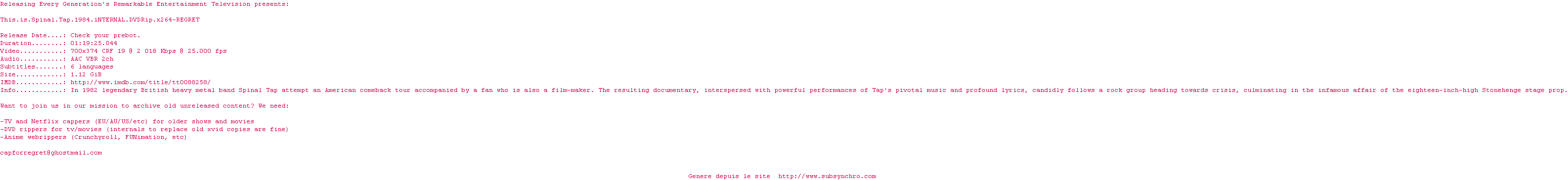 Voir le nfo de la release This.Is.Spinal.Tap.1984.iNTERNAL.DVDRip.x264-REGRET