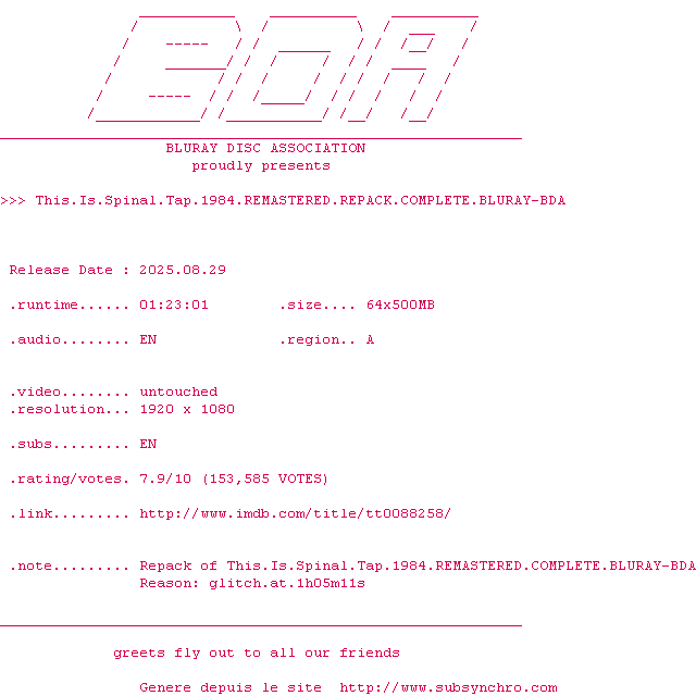 Voir le nfo de la release This.Is.Spinal.Tap.1984.REMASTERED.REPACK.COMPLETE.BLURAY-BDA