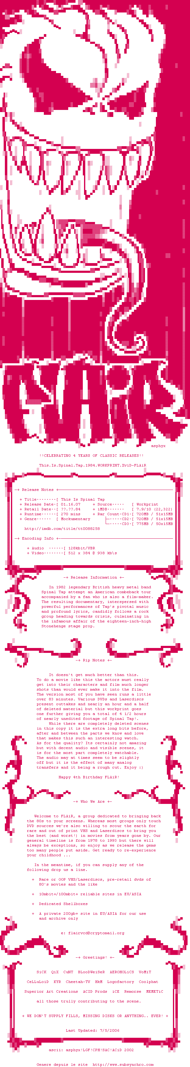 Voir le nfo de la release This.Is.Spinal.Tap.1984.WORKPRINT.XviD-FLAiR