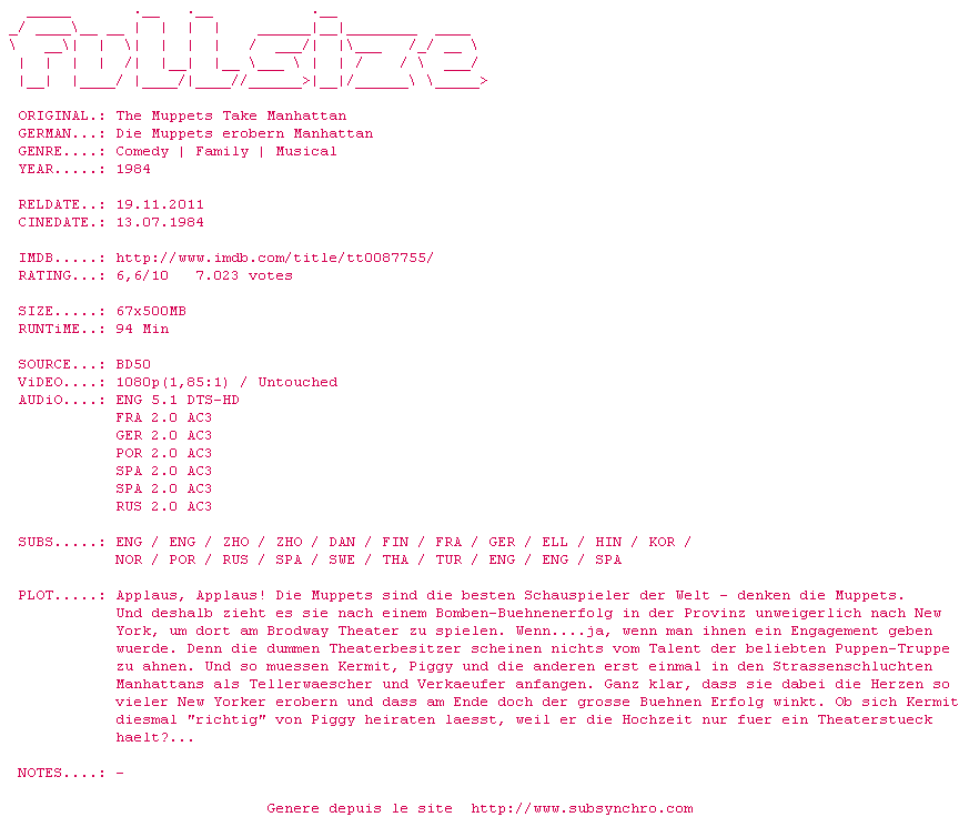 Y avez-vous pense ? Nous proposons déjà 1 sous-titre pour le film Les Muppets à  Manhattan. Avez-vous essaye de voir si ces sous-titres etaient compatibles avec cette release ? On vous laisse le soin de tester cela pour nous et de contribuer au site en postant le sous-titre en cas de compatiblite constatee !