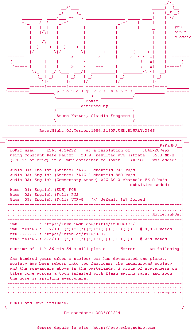 Telechargez le RSS « Fichier de la release Rats.Night.Of.Terror.1984.2160P.UHD.BLURAY.x265-WATCHABLE »