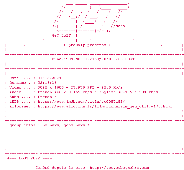 Juste pour info il existe une version intitulée Dune: The Alternative Edition Redux qui est facilement trouvable avec des sous titres anglais. Ce montage fait par un fan est nettement meilleur que celui sorti au cinéma avec le rajout de nombreuse scène et de grosses motifs dans le développement de l'histoire qui rendent le film bien meilleur. Mis à part bien évidemment les effets spéciaux ultra kitch.