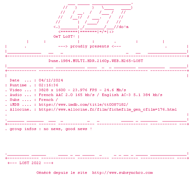 Le commentaire de Un membre qui nexiste plus Commente par un visiteur, Le Mercredi 28 Mai 2014 à 13h35 Juste pour info il existe une version intitulée Dune: The Alternative Edition Redux qui est facilement trouvable avec des sous titres anglais. Ce montage fait par un fan est nettement meilleur que celui sorti au cinéma avec le rajout de nombreuse scène et de grosses motifs dans le développement de l'histoire qui rendent le film bien meilleur. Mis à part bien évidemment les effets spéciaux ultra kitch. 1 0
