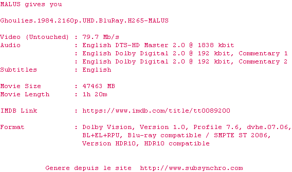 Voir le nfo de la release Ghoulies.1984.2160p.UHD.BluRay.H265-MALUS