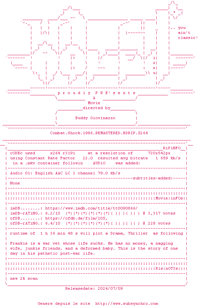 Voir le nfo de la release Combat.Shock.1986.1080P.BLURAY.x264-WATCHABLE