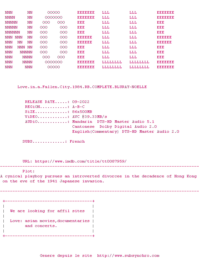 Voir le nfo de la release Love.In.A.Fallen.City.1984.RB.COMPLETE.BLURAY-NOELLE