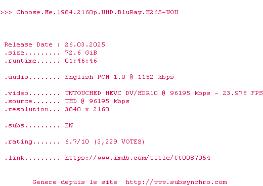 Voir le nfo de la release Choose.Me.1984.2160p.UHD.BluRay.H265-WOU