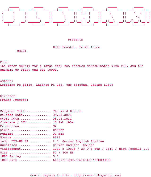 Telechargez le RSS « Fichier de la release Wild.Beasts.-.Belve.Feroci.UNCUT.1984.MULTi.COMPLETE.BLURAY-OLDHAM »