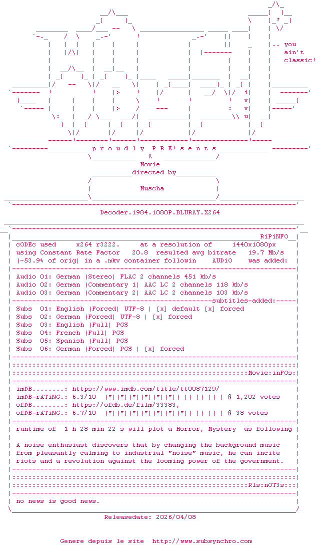Y avez-vous pense ? Nous proposons déjà 1524 sous-titres pour le film Decoder. Avez-vous essaye de voir si ces sous-titres etaient compatibles avec cette release ? On vous laisse le soin de tester cela pour nous et de contribuer au site en postant le sous-titre en cas de compatiblite constatee !
