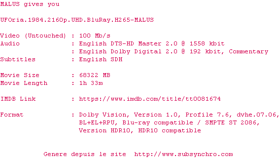 Y avez-vous pense ? Nous proposons déjà 1630 sous-titres pour le film UFOria. Avez-vous essaye de voir si ces sous-titres etaient compatibles avec cette release ? On vous laisse le soin de tester cela pour nous et de contribuer au site en postant le sous-titre en cas de compatiblite constatee !