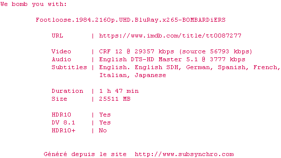 Voir le nfo de la release Footloose.1984.2160p.UHD.BluRay.H265-GAZPROM