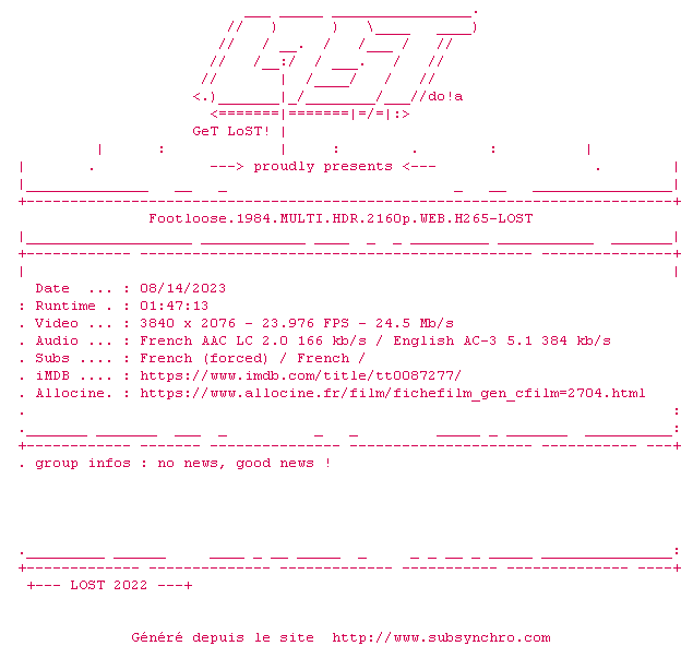 Voir le nfo de la release Footloose.1984.MULTI.HDR.2160p.WEB.H265-LOST
