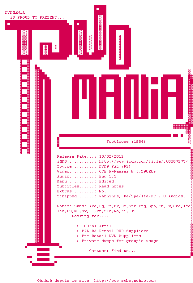 Voir le nfo de la release Footloose.1984.MULTiSUBS.PAL.DVDR-DVDMANiA