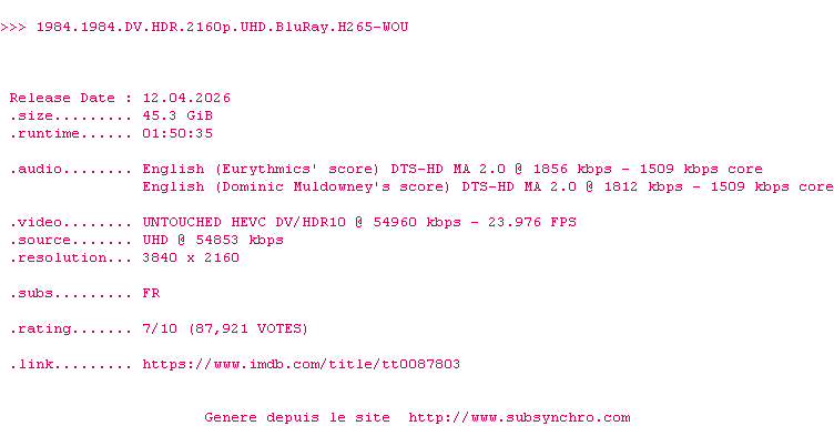 Y avez-vous pense ? Nous proposons déjà 1660 sous-titres pour le film 1984. Avez-vous essaye de voir si ces sous-titres etaient compatibles avec cette release ? On vous laisse le soin de tester cela pour nous et de contribuer au site en postant le sous-titre en cas de compatiblite constatee !