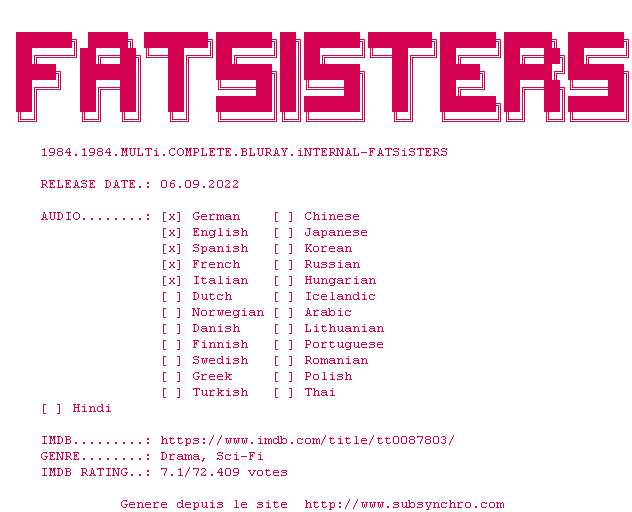Y avez-vous pense ? Nous proposons déjà 1660 sous-titres pour le film 1984. Avez-vous essaye de voir si ces sous-titres etaient compatibles avec cette release ? On vous laisse le soin de tester cela pour nous et de contribuer au site en postant le sous-titre en cas de compatiblite constatee !