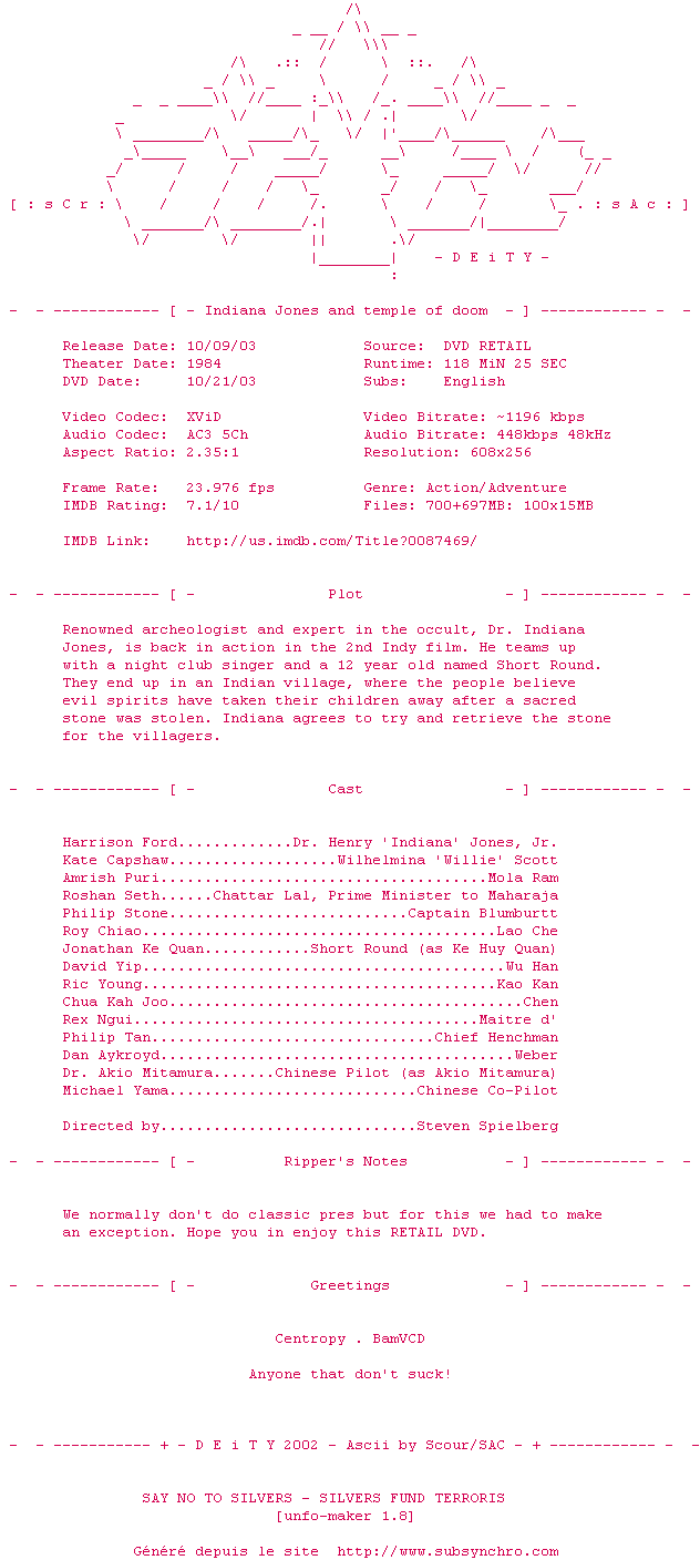 Indiana.Jones.And.The.Temple.Of.Doom.DVDRiP.XViD-DEiTY.zip Ajouté par XeiS Ajoute le 26-03-2010 23:53:04 Format : ZIP Italique : Non Taille : 0.00Ko Telechargement : 88 Le fichier 52-1269643984.zip n'existe pas ! Ajouter cette release à ma collection en cas de telechargement des sous-titres 0 0 0 Telecharger le ZiP contenant NFO, Affiche, Sous-titre (*.zip) Commentez le fichier Indiana.Jones.And.The.Temple.Of.Doom.DVDRiP.XViD-DEiTY.zip Commentez le fichier Indiana.Jones.And.The.Temple.Of.Doom.DVDRiP.XViD-DEiTY.zip Commentez ce fichier Le fichier 52-1269643984.zip n'existe pas ! Telechargez le RSS « Fichier de la release Indiana.Jones.And.The.Temple.Of.Doom.DVDRiP.XViD-DEiTY » Retour au film « Indiana Jones et le Temple maudit »