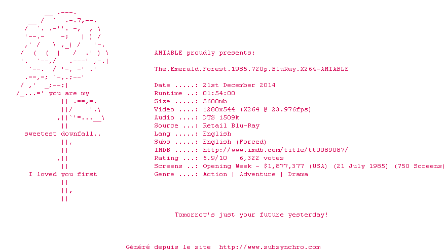 Voir le nfo de la release The.Emerald.Forest.1985.720p.BluRay.X264-AMIABLE