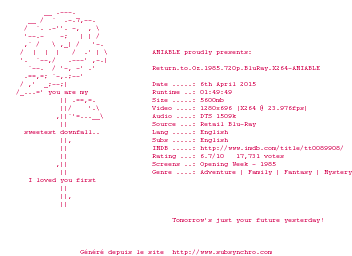 | Voir le nfo de la release Return.to.Oz.1985.720p.BluRay.X264-AMIABLE | AMIABLE | Return.to.Oz.1985.720p.BluRay.X264-AMIABLE OpenSubtitles | 0 fichier |