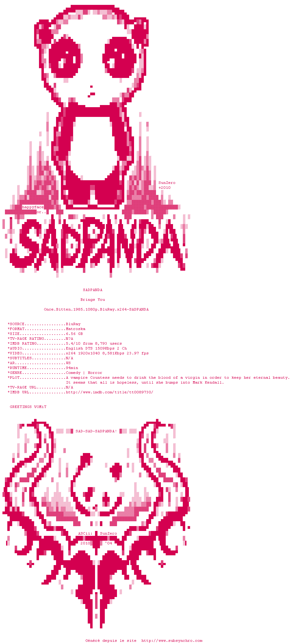| Voir le nfo de la release Once.Bitten.1985.1080p.BluRay.x264-SADPANDA | SADPANDA | Once.Bitten.1985.1080p.BluRay.x264-SADPANDA OpenSubtitles | 0 fichier | ||