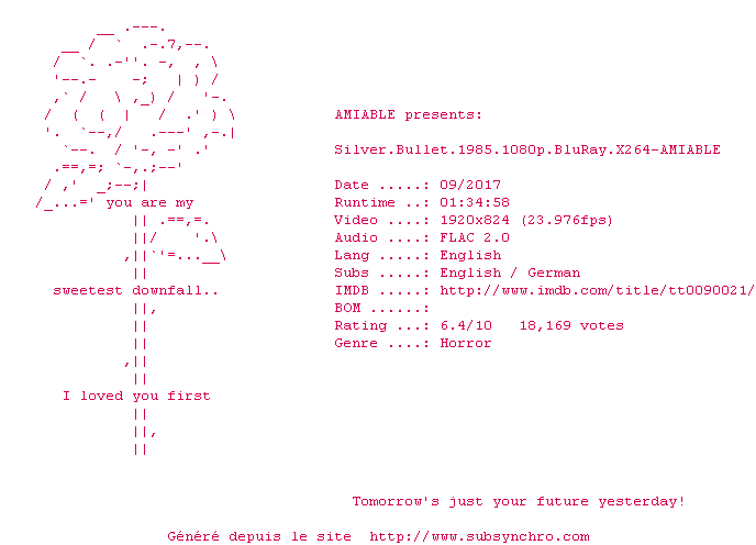 Voir le nfo de la release Silver.Bullet.1985.1080p.BluRay.x264-AMIABLE