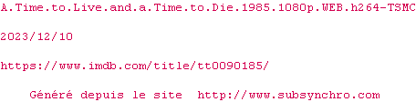 | Voir le nfo de la release A.Time.To.Live.And.A.Time.To.Die.1985.1080p.WEB.H264-TSMC | TSMC | A.Time.To.Live.And.A.Time.To.Die.1985.1080p.WEB.H264-TSMC OpenSubtitles | 0 fichier |