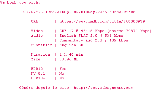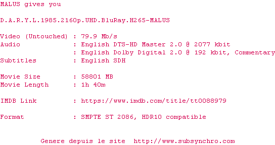 Voir le nfo de la release D.A.R.Y.L.1985.2160p.UHD.BluRay.H265-MALUS