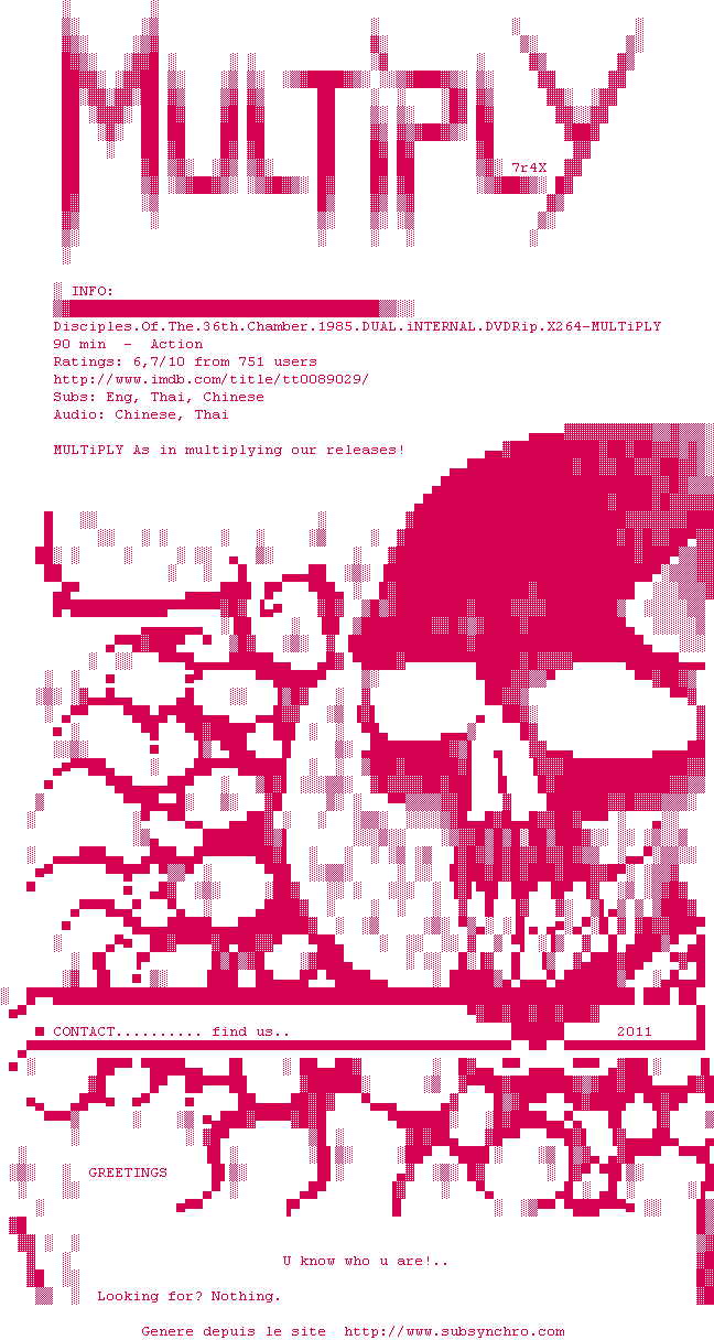 Voir le nfo de la release Disciples.Of.The.36th.Chamber.1985.DUAL.iNTERNAL.DVDRip.x264-MULTiPLY