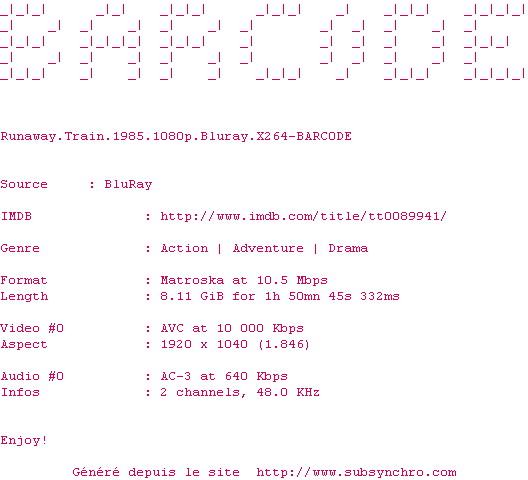 Voir le nfo de la release Runaway.Train.1985.1080p.Bluray.X264-BARC0DE