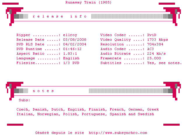 Voir le nfo de la release Runaway.Train.1985.DVDRip.XviD-ellroy