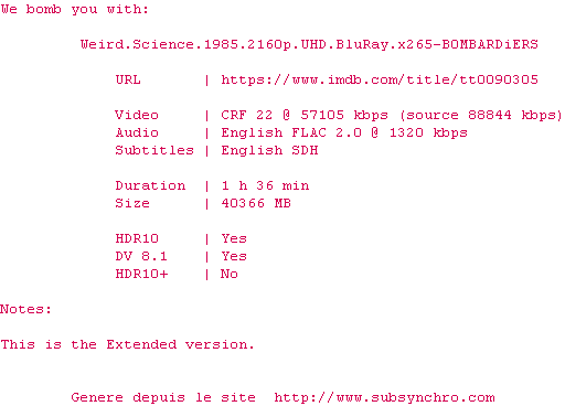 Voir le nfo de la release Weird.Science.1985.EXTENDED.2160p.UHD.BluRay.H265-WOU