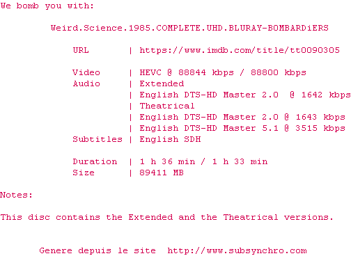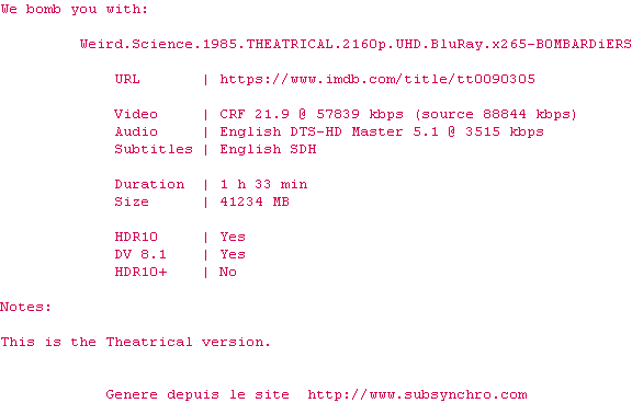 Voir le nfo de la release Weird.Science.1985.THEATRICAL.2160p.UHD.BluRay.x265-B0MBARDiERS