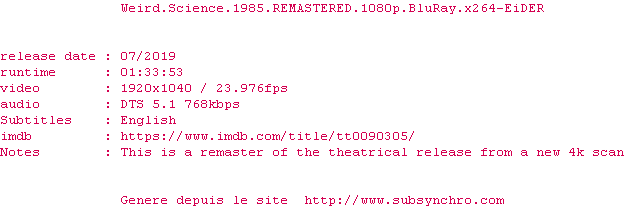 Voir le nfo de la release Weird.Science.1985.REMASTERED.1080p.BluRay.x264-EiDER