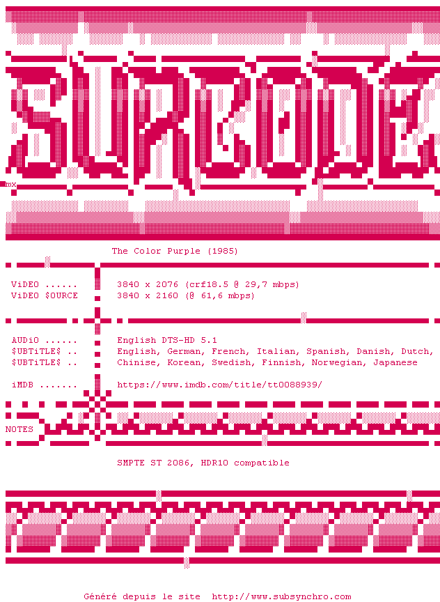 Voir le nfo de la release The.Color.Purple.1985.2160p.UHD.BluRay.x265-SURCODE